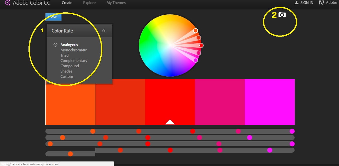 Adobe Color dapat memberikan kita kombinasi warna yang harmonis secara presisi melalui 2 tipe input (lihat gambar):